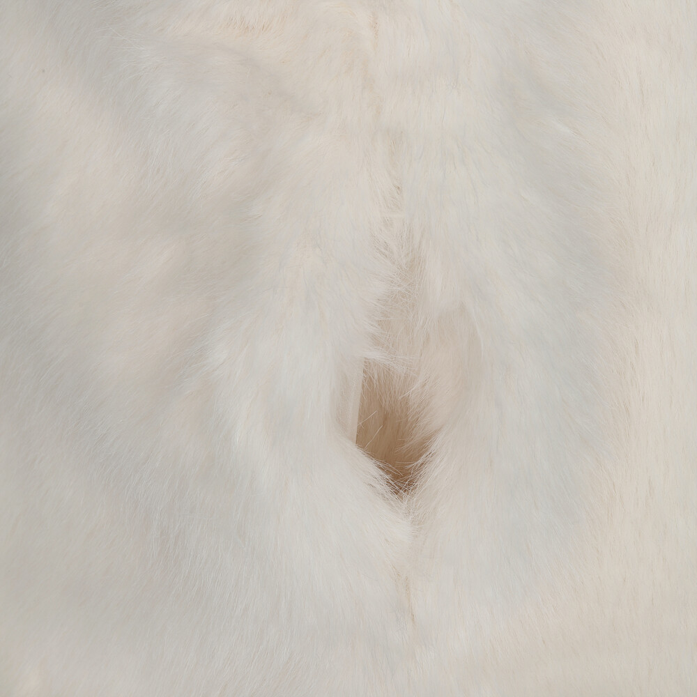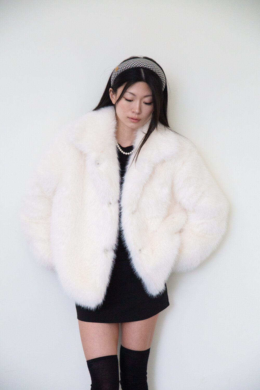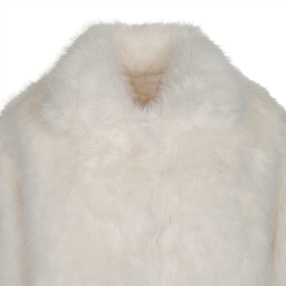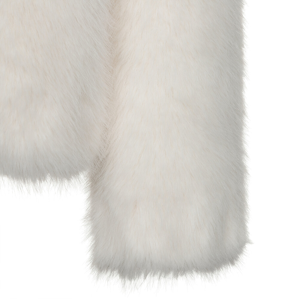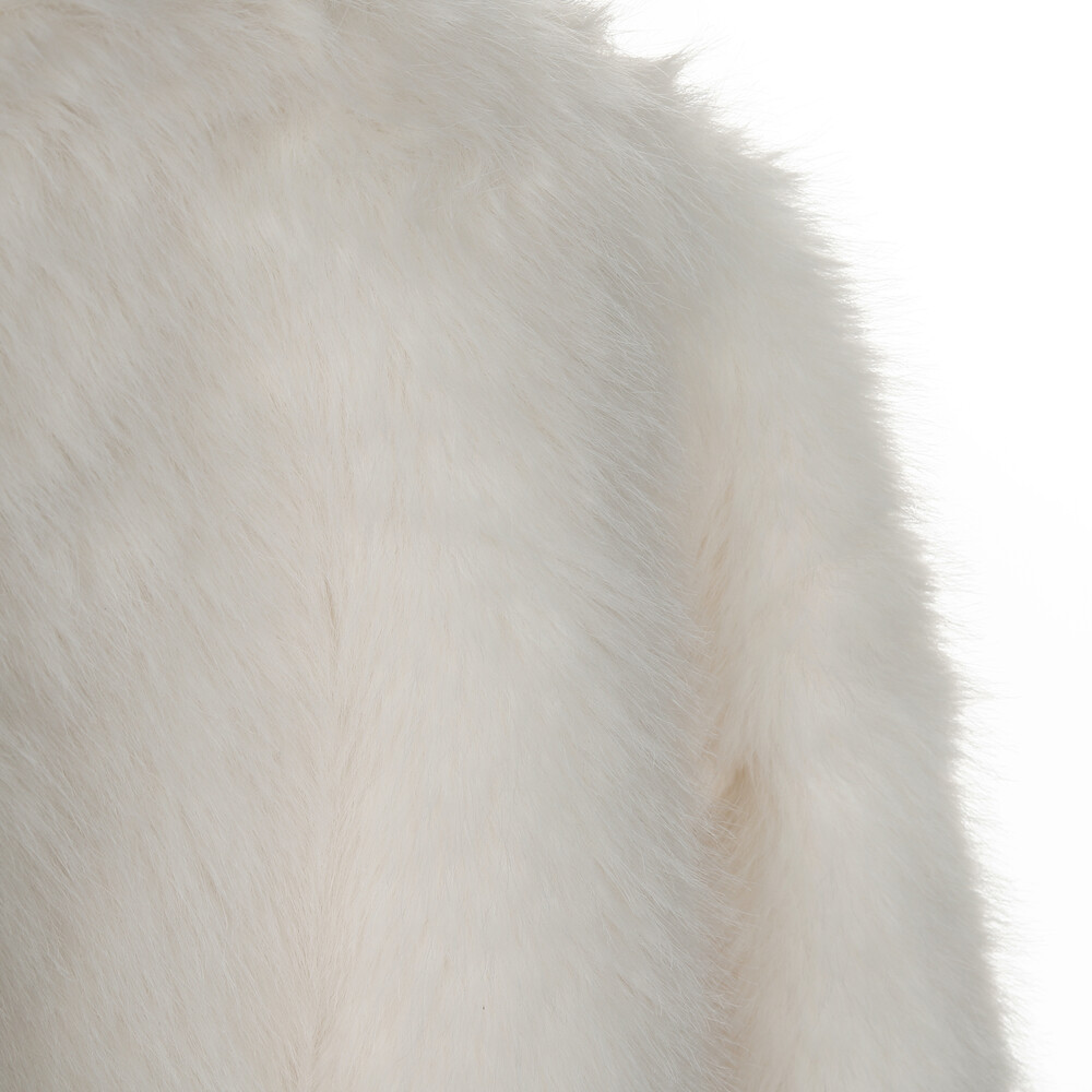 A premium fox faux fur jacket in a pure white tone with no yellow undertone,