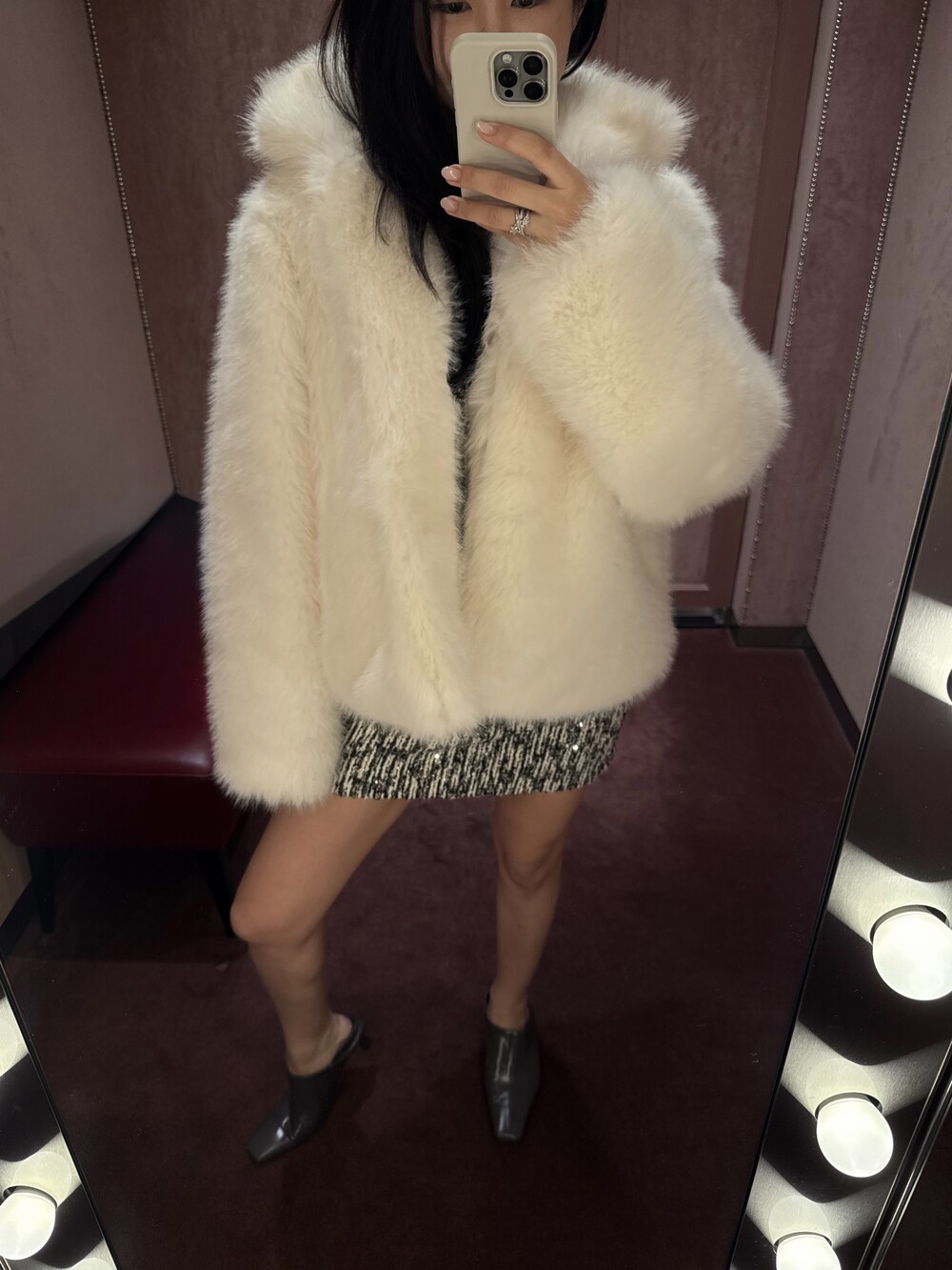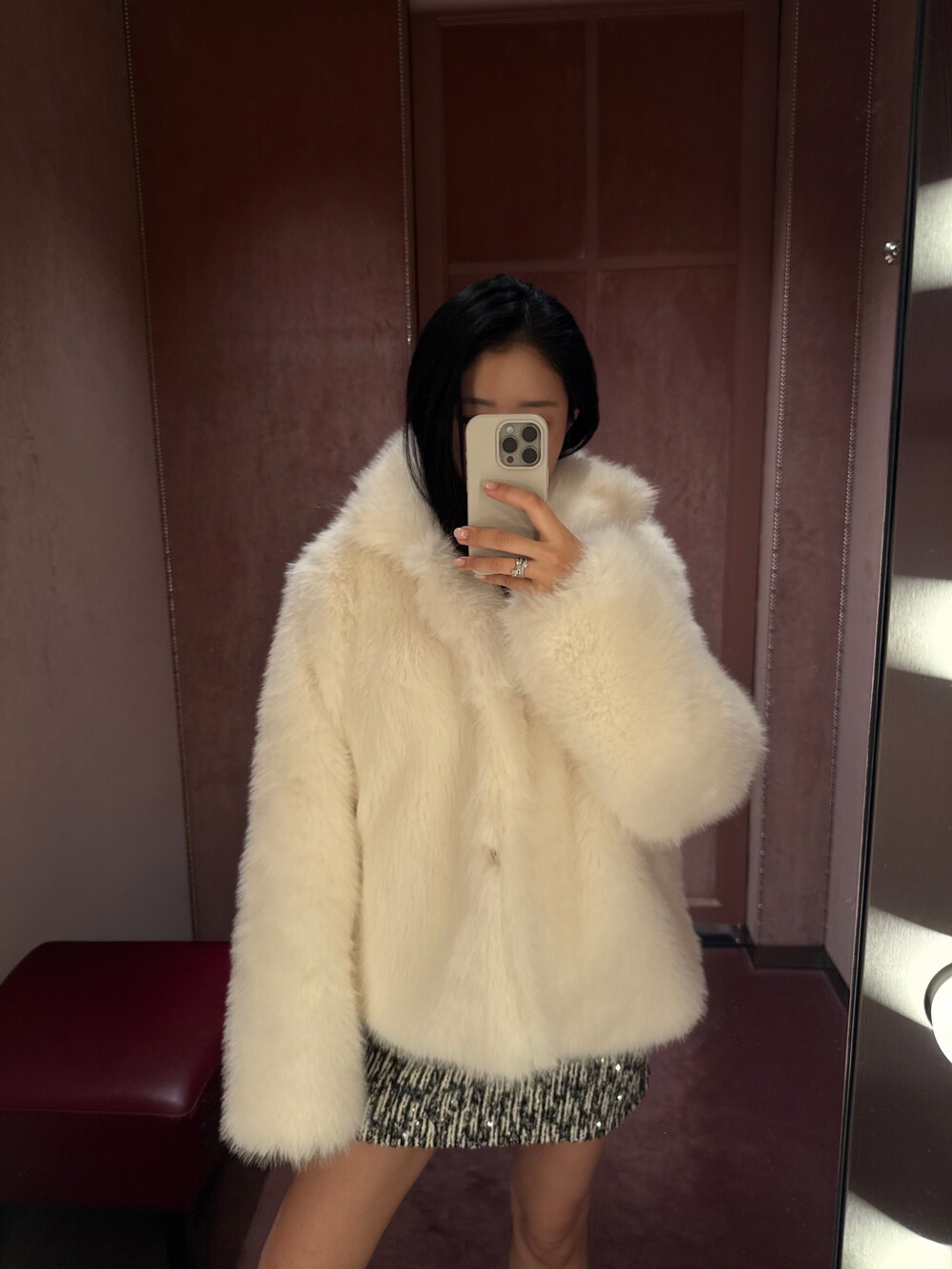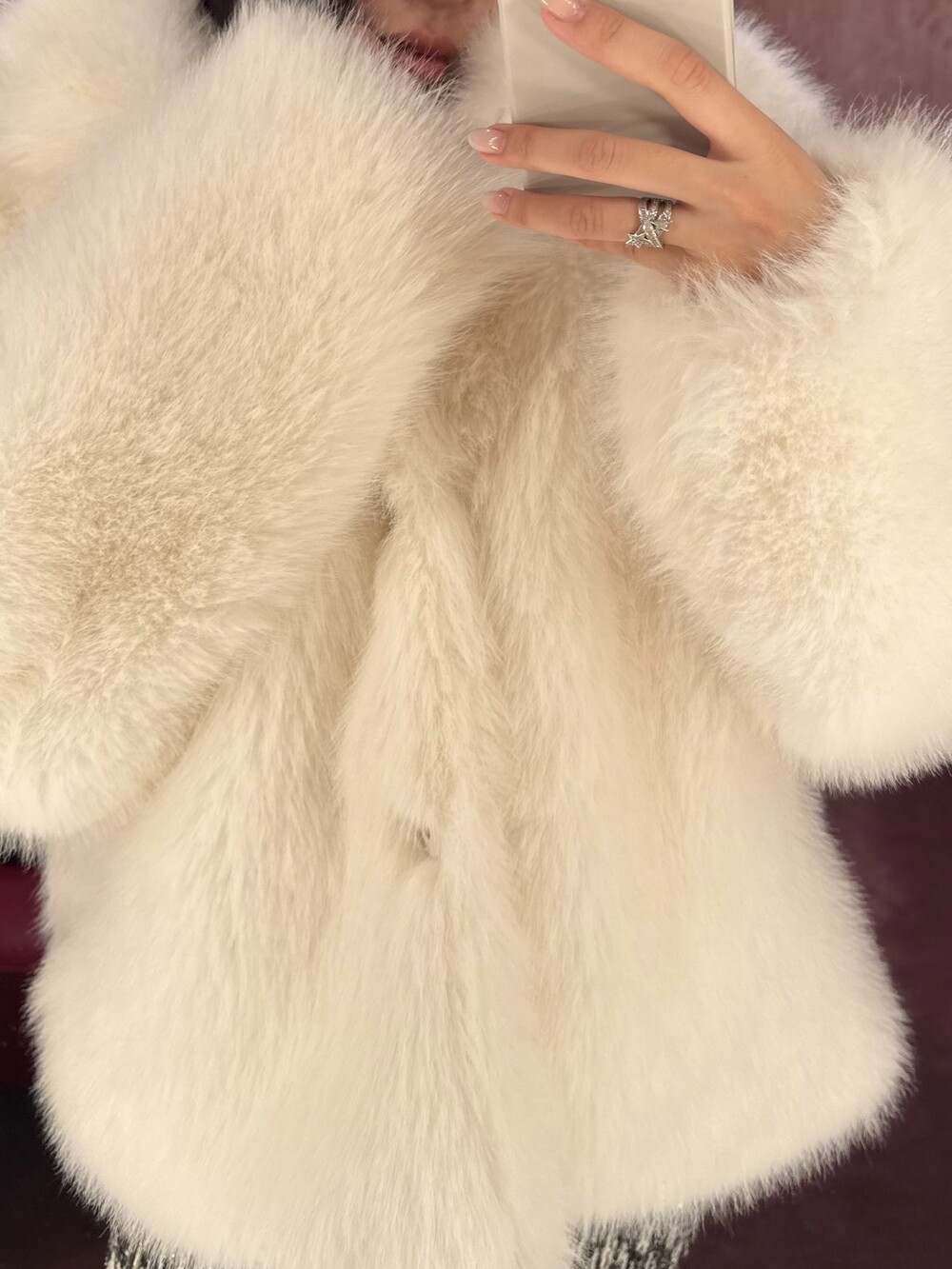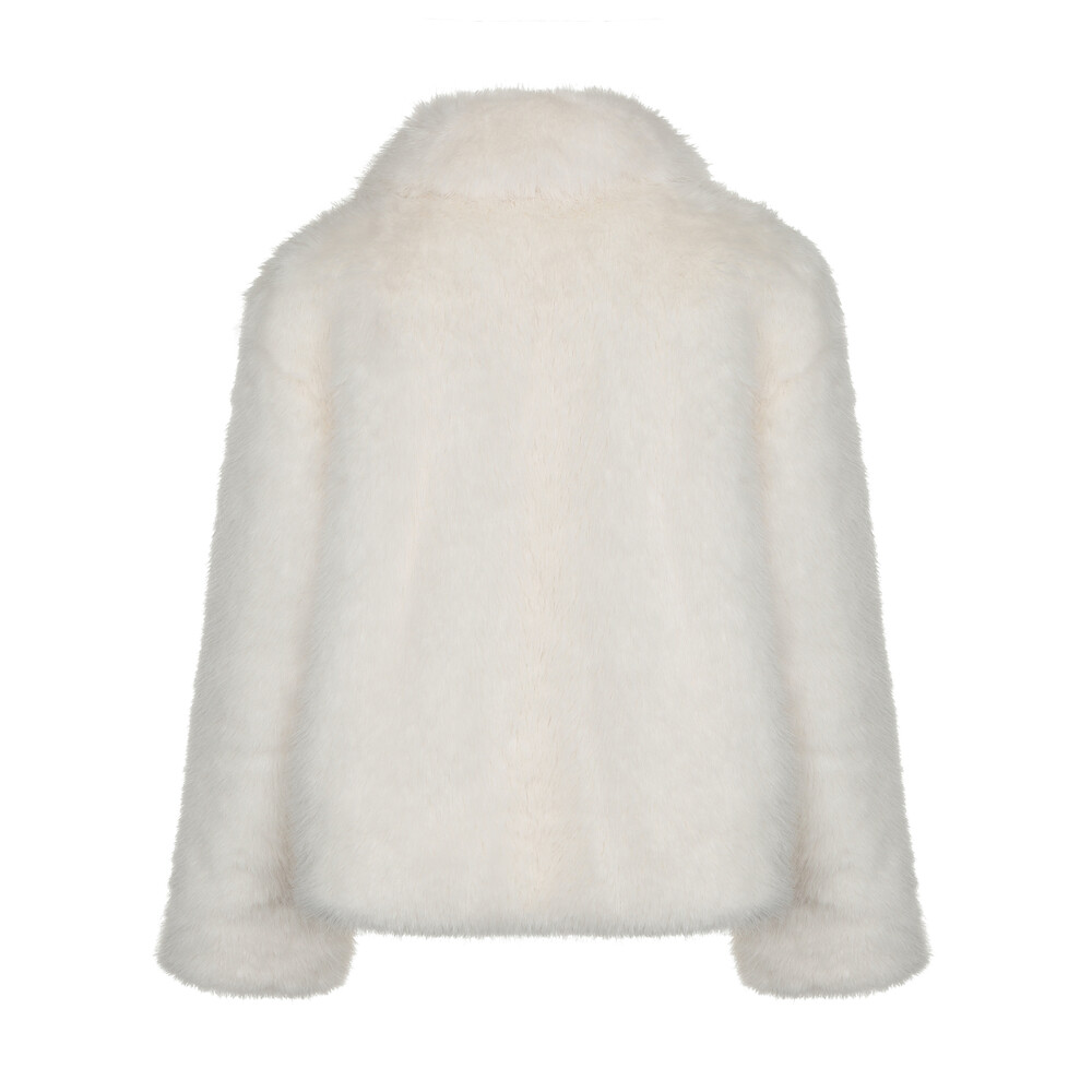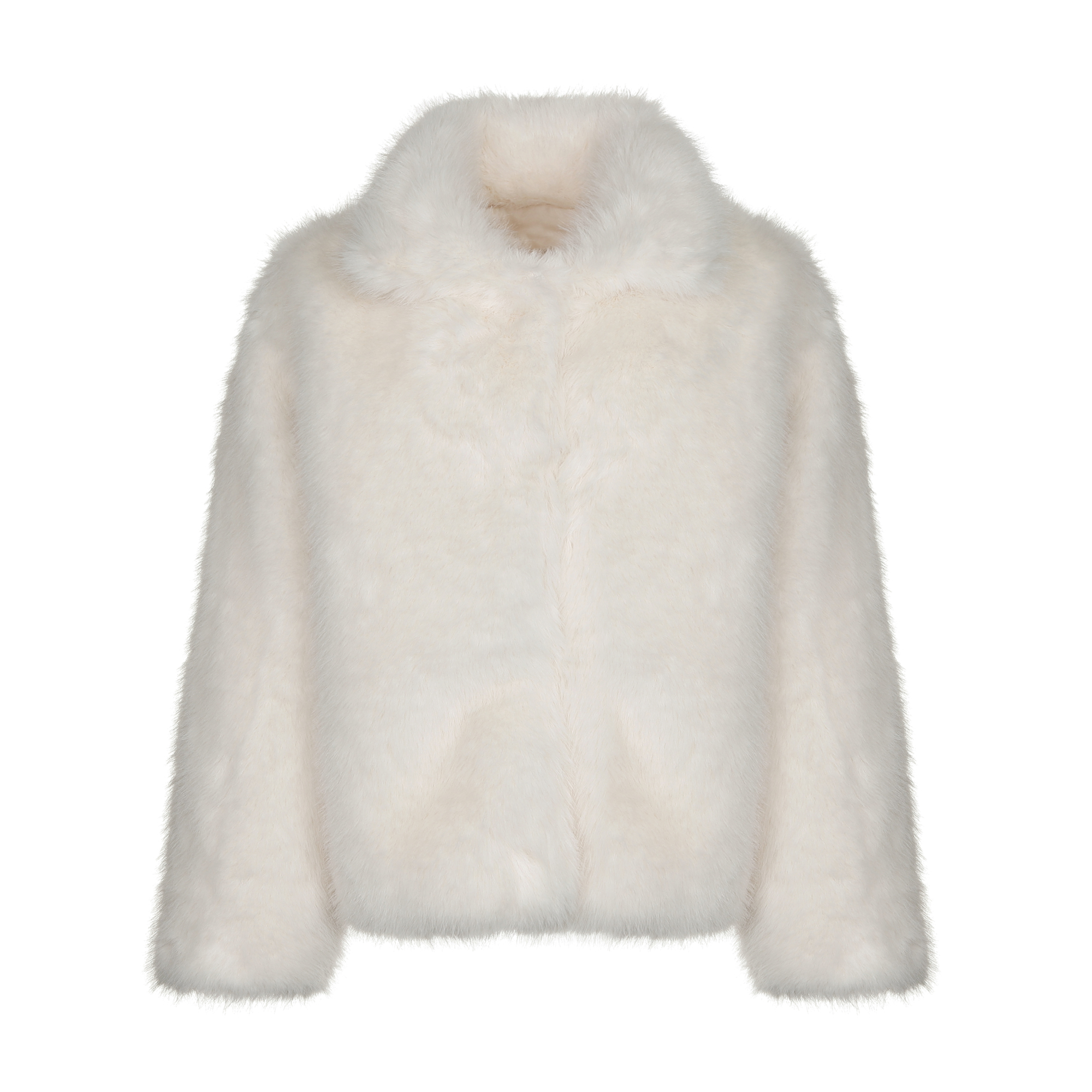 A premium fox faux fur jacket in a pure white tone with no yellow undertone,