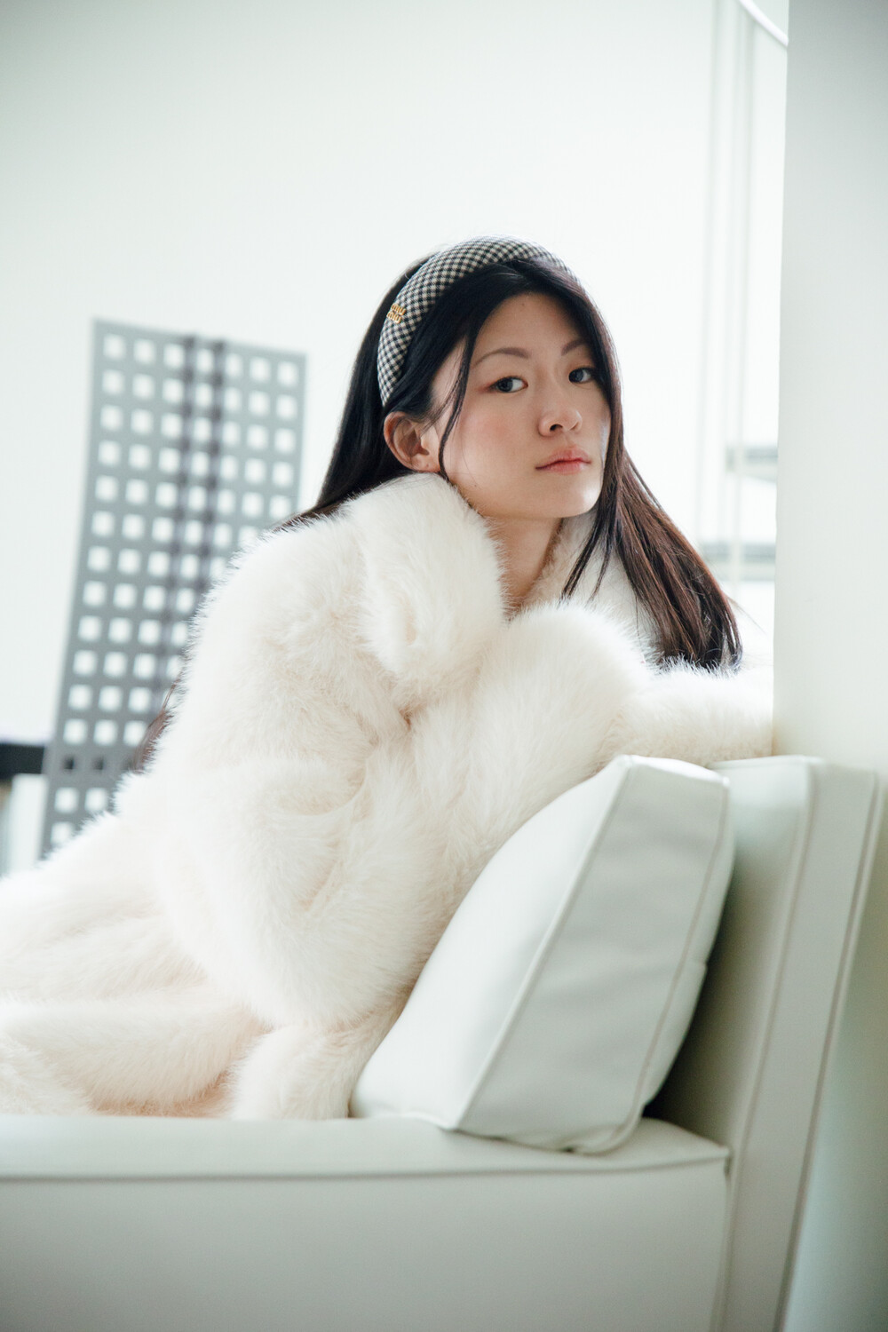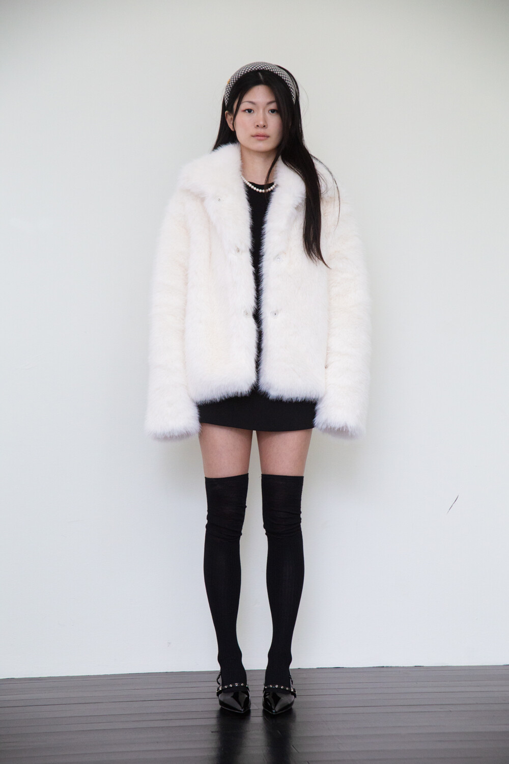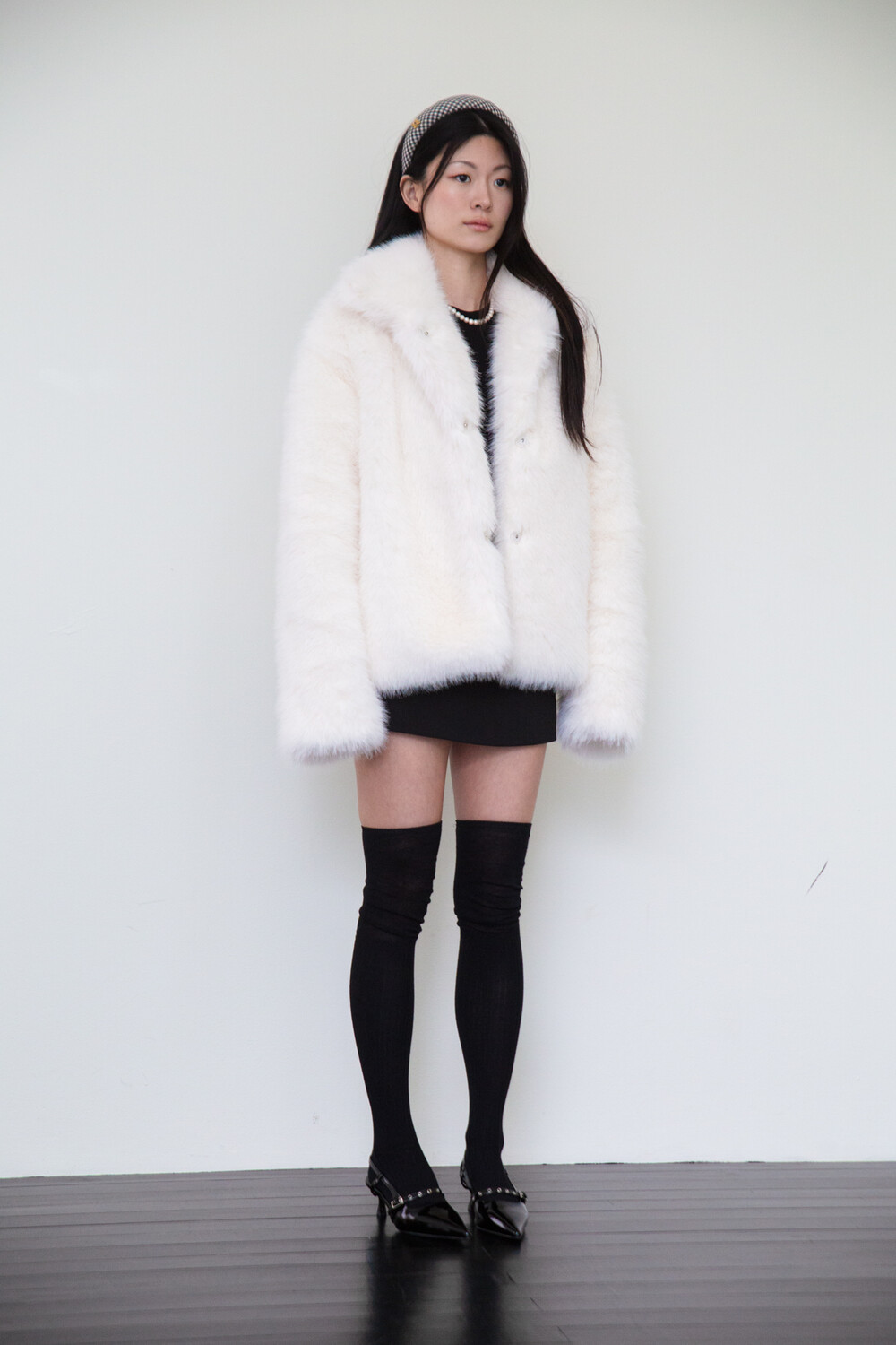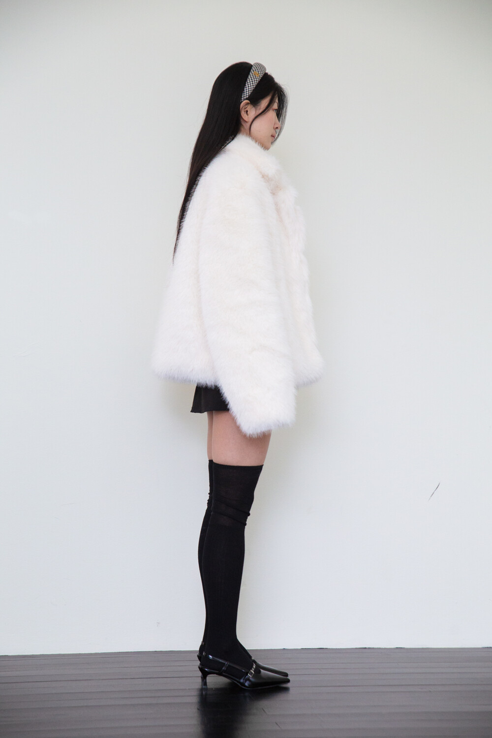 A premium fox faux fur jacket in a pure white tone with no yellow undertone,